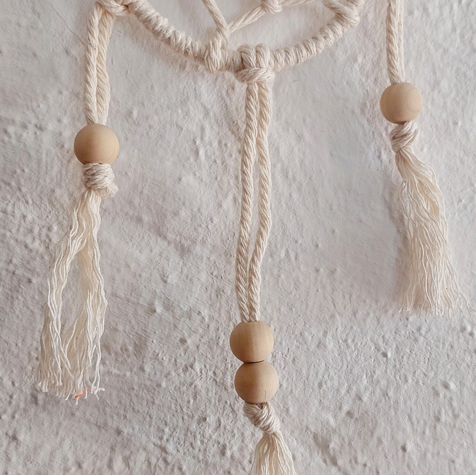 Materialien: Hochwertiges, naturfarbenes Makramee-Garn (100% Baumwolle), stabiler Holzring, und eine Auswahl an natürlichen Holzperlen.